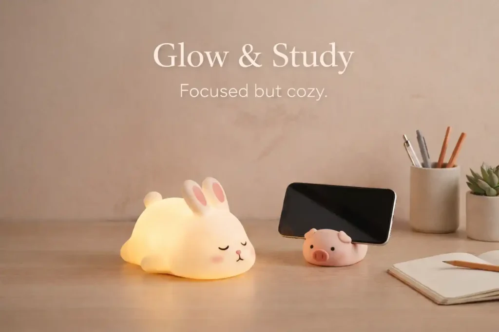 Turn off the stress with adorable night lights and soft toys that glow and squish